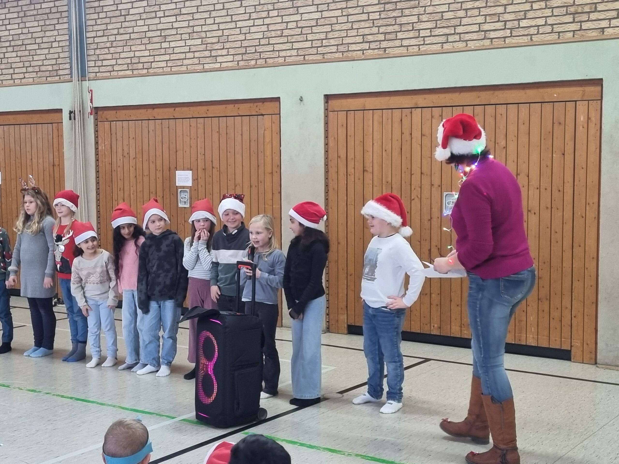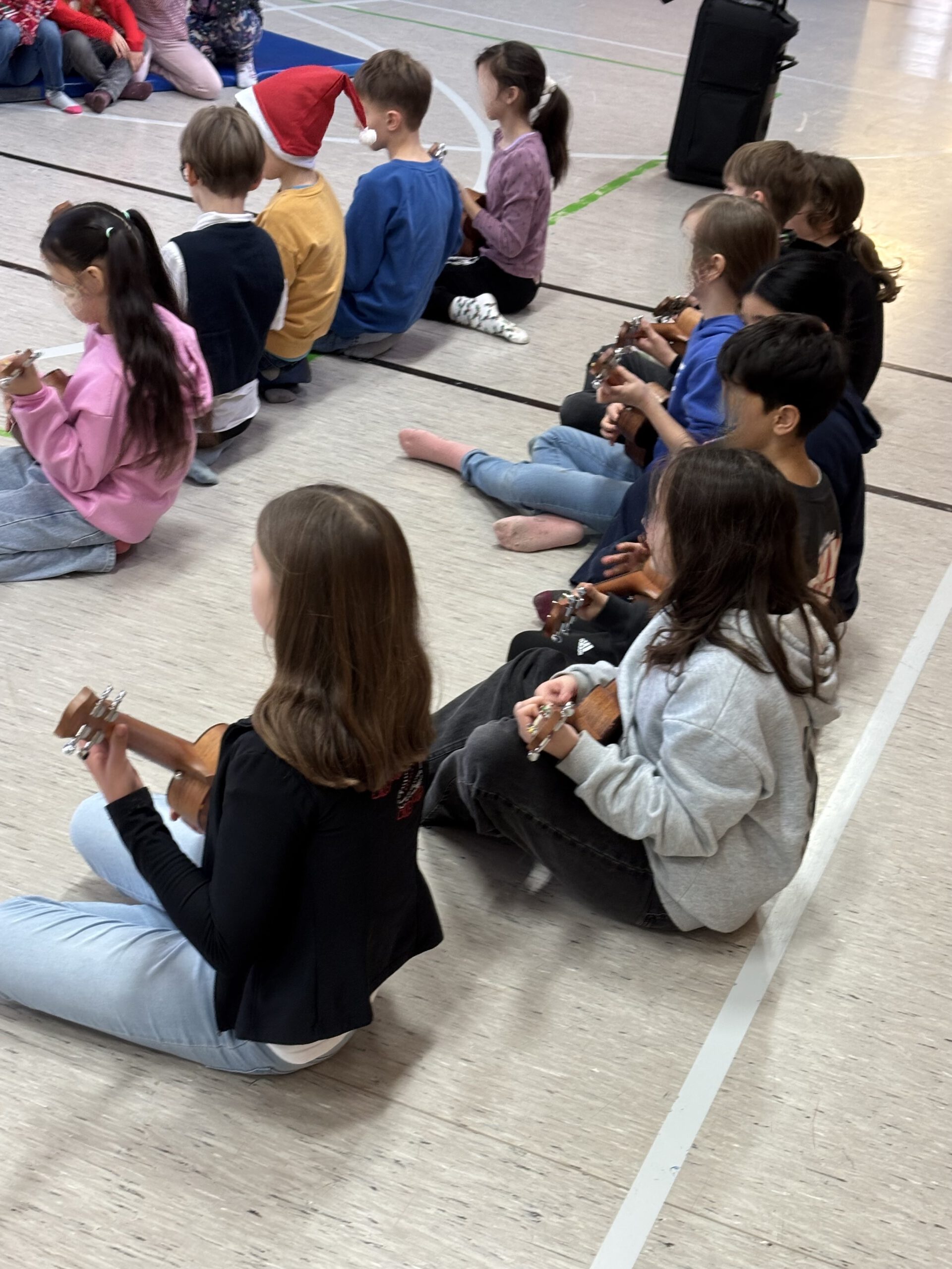 Am letzten Schultag vor den Weihnachtsferien gab es nicht nur unser gemeinsames Frühstück, sondern auch ein großes Weihnachtsforum in der Turnhalle. Einige Klassen und die Ukulele-AG haben etwas vorgeführt und das Publikum in Weihnachtsstimmung versetzt. Am Ende wurde gemeinsam „In der Weihnachtsbäckerei“ gesungen.